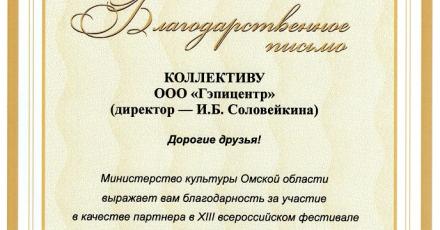 За помощь в проведении XIII Всероссийского фестиваля авторской песни и поэзии «Камертон» ГЭПИЦентр удостоен Благодарственного письма Министерства культуры Омской области.