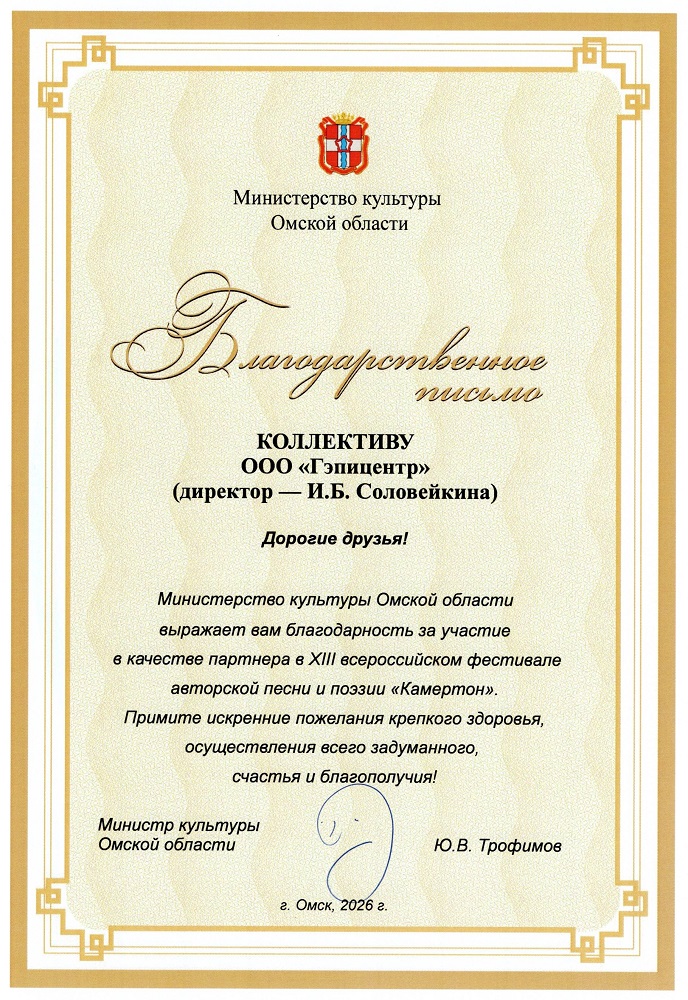 За помощь в проведении XIII Всероссийского фестиваля авторской песни и поэзии «Камертон» ГЭПИЦентр удостоен Благодарственного письма Министерства культуры Омской области.